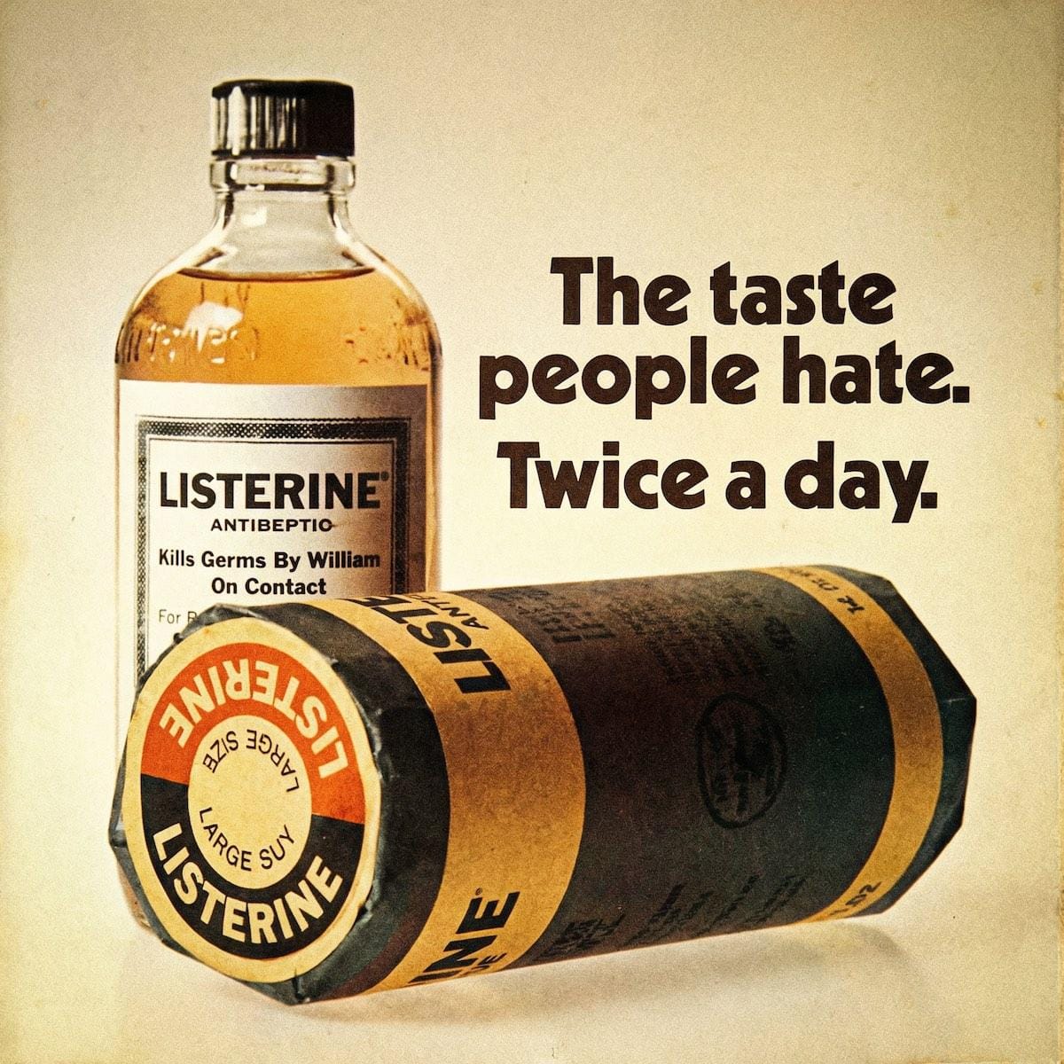Listerine berbat tadını itiraf ettiğinde, bunu "Günde iki kez, nefret ettiğiniz tat" sloganı ile tamamladı. İnsanlar işe yaradığına inandı. Çünkü tadı ancak bu kadar kötü olan bir şey bakterileri de öldürebilirdi.